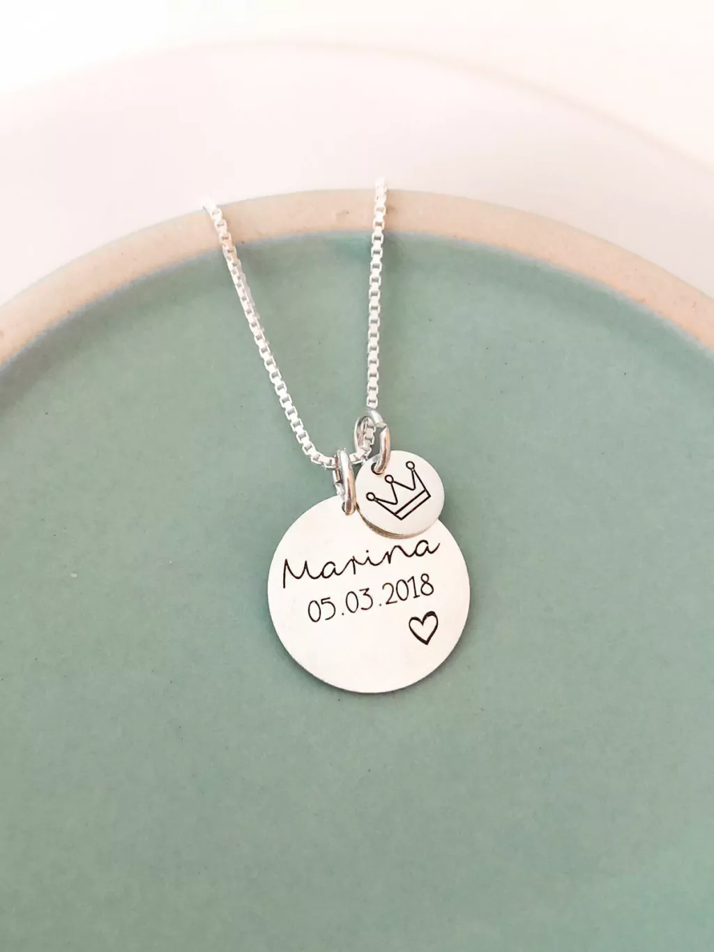 Colar personalizado Medalha Nome + Data e Pingente de Coroa - Prata 925